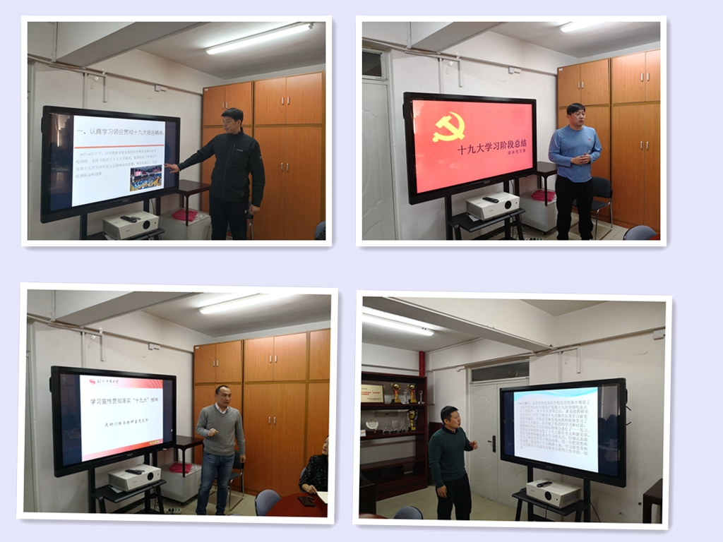 各支部分别从党的十九大精神学习计划、学习进度、学习方式方法、开展活动情况、取得实效等方面进行了汇报,通过图文并茂的PPT充分展示了各支部开展学习的情况。各支部根据自身特点利用实地参观、观看学习视频、集中学习与自学相结合、建立微信学习小组、征文、我来讲党课、撰写心得体会等多种学习形式,将学习宣传贯彻十九大精神做出了亮点和特色。