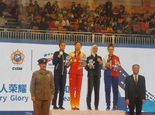 2019年10月25,26日,第七届世界军人运动会在武汉体育馆开始了跆拳道项目的比拼。20岁的宋洁和21岁的张梦宇分别夺得62公斤,67公斤两枚金牌。赛后,她们满怀着骄傲与喜悦,身披国旗绕场一周后,朝着场下两面观众席庄重地各敬了一次军礼。这一幕成为了今日军运会跆拳道赛场最动人的瞬间。