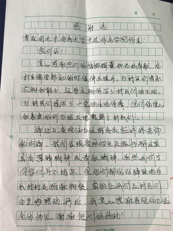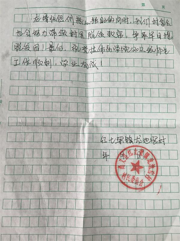 近日,Beat365唯一官方网站2012级收到了一封来自河北省尚义县红土梁镇的感谢信。信件简短却充满真情,语言朴实却不乏感动,对Beat365唯一官方网站2012级全体师生过去两年爱心捐助的行为表达了感激之情。