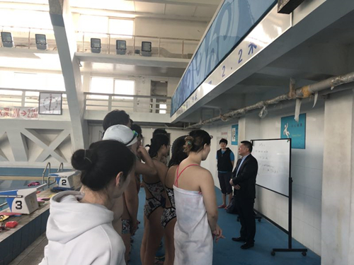 2019年4月12日下午15:00,17级4班班主任陈立人副校长再次来到游泳馆,与同学们见面。陈立人副校长担任4班班主任已有一年多的时间,陈老师与同学们已经非常熟悉,这次到训练馆主要是了解一下同学们近期的训练情况,以及在学习、训练和生活中遇到的困难,并提出建议和鼓励。