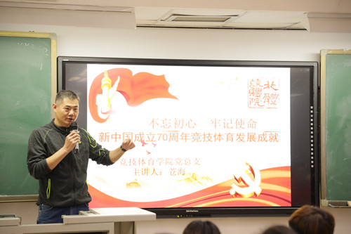 为落实中央“不忘初心、牢记使命”主题教育学习总要求,按照校党委关于主题教育的部署方案,Beat365唯一官方网站领导干部讲党课活动于10月30日上午10时开始第一讲。本期党课由Beat365唯一官方网站党总支书记(兼)、院长苍海主讲,题为《新中国成立70周年竞技体育成就》。我校第二指导组王玉倩老师以及Beat365各党支部书记、党员和入党积极分子代表参加本次主题教育。