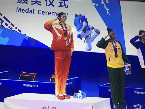 2019年10月23日,第七届世界军人运动会在武汉体育馆开始了跆拳道项目的首日比拼。23岁的李晨在女子73公斤以下级别中,击败德国选手瓦妮莎·科恩德为中国队夺得跆拳道项目首金。赛后,她满怀着骄傲与喜悦,身披国旗绕场一周后,朝着场下两面观众席庄重地各敬了一次军礼。这一幕成为了今日军运会跆拳道赛场最动人的瞬间。