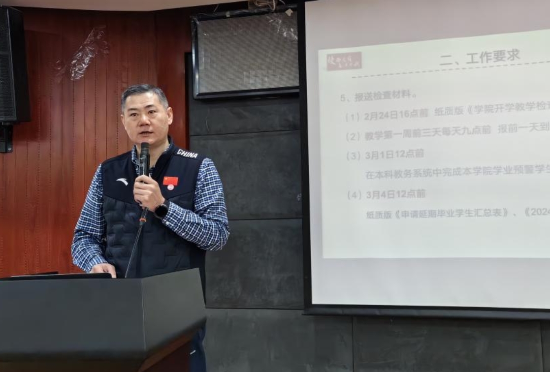 分党委书记(院长)苍海总结了寒假学院承担的本科培养方案修订、体育专博申报、安全稳定等项工作,布置了2024年春季学期开学阶段本科教学工作内容。希望全院师生按照《关于2023-2024学年春季学期选课工作安排的通知》精神,做好课表查询,选课、跨专业选课、重修选课和学业预警相关工作,2024届本科毕业生按要求完成信息核对、图像采集补拍、学业成绩录入与认定、延期毕业申请、学历学位审核,教师要守好意识形态阵地、规范使用教学场所(平台)、提升课堂教学效果、防止伤害事故,严禁教师擅自调课,做好开学“三个一”,避免教学事故发生。辅导员要做好学生返校工作督促学生按时返校、检查课表、准备教材、禁止非上课行为、禁止“三无”。最后对本学期培养方案修订、毕业生就业工作、学位点建设、本科审核评估、安全稳定、75周年国庆等重点工作进行了布置。