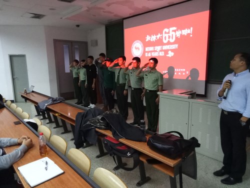 会议开始,王广明同学以幽默风趣的开场带领老师和同学们一起走进了铁血军营。诸葛宇骜、毛崇旭和李辉鸿三位同学结合自己在部队的生活经历,从爱国、感恩、珍惜、坚持、责任、担当和友情等方面畅谈感悟,并认真规划退伍后的学习与生活、积极展望未来,精彩的报告不时引起在座同学的阵阵掌声。三位同学报告结束,由李健老师提议,所有退伍军人一起合唱了《强军战歌》献礼母校建校65周年,歌声唱出了他们的铁血柔情,唱出了属于他们的军旅青春。随后由何玲老师讲话,何老师告诫同学们要珍惜大学剩下的一年多时间,认真规划未来,不负光阴,勇敢追求自己的梦想,展现北体人的精神面貌。
