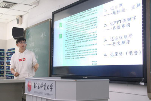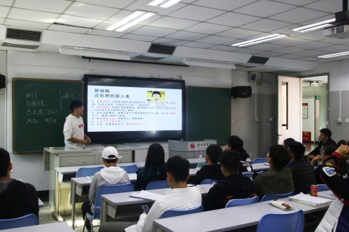 杜其然同学首先就新闻稿的写作方法及注意事项进行讲解,并以一篇新闻稿为例,向大家展示了规范标准的新闻稿并强调写完必须要仔细通读,才能保证新闻稿的质量。紧接着,杜其然同学为大家讲解关于单反设备摄影的基本使用,将摄影主要的三个要素关系以简单形象的方式进行讲解,同学们深深的被他的话语所吸引,并认真记下笔记。