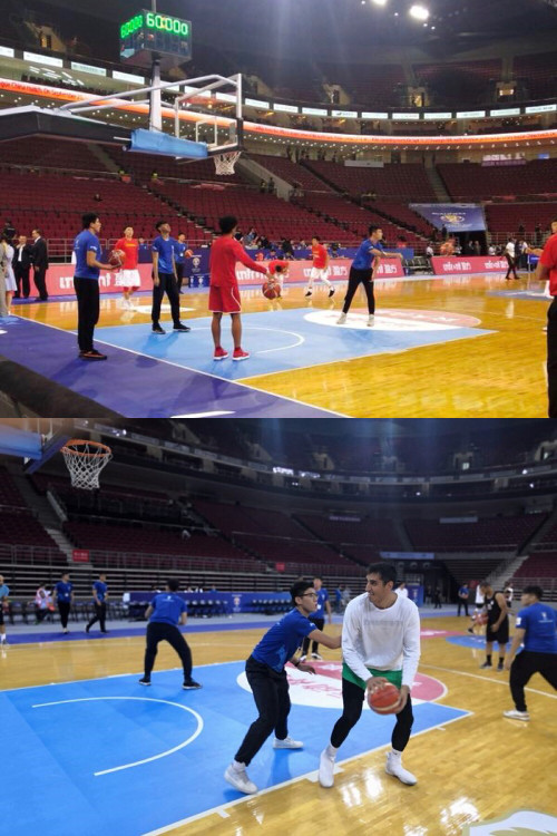 配合约旦队队员进行活动前热身