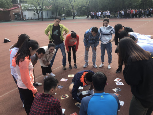 在尹小光老师和拓展员张增甜学长的带领下,团建活动从破冰游戏“抓手指”中开始,通过游戏,不仅活跃了氛围,也让大家懂得专注于目标的重要性,而游戏中那个蕴含哲理的故事更是告诉大家,在研究生的求学期间,每位同学都应保持一个“空杯心态”,只有时刻怀着谦卑的心,才能让我们容纳更多的知识。接着,全体同学被随机分成了7个小组,在自我介绍、确定组名后,开始了“急速六十秒”的比赛。游戏中,三十张各有寓意的卡片随意的铺洒一地,各队的同学们群策群力、各显其才,现场欢声笑语不断,大家早已将胜负忘却,沉浸在集体的欢乐与温暖中,尽情享受着团建带来的乐趣。